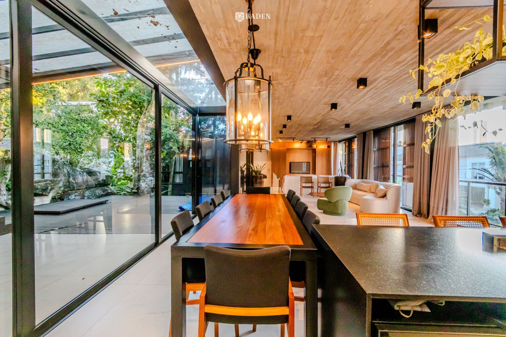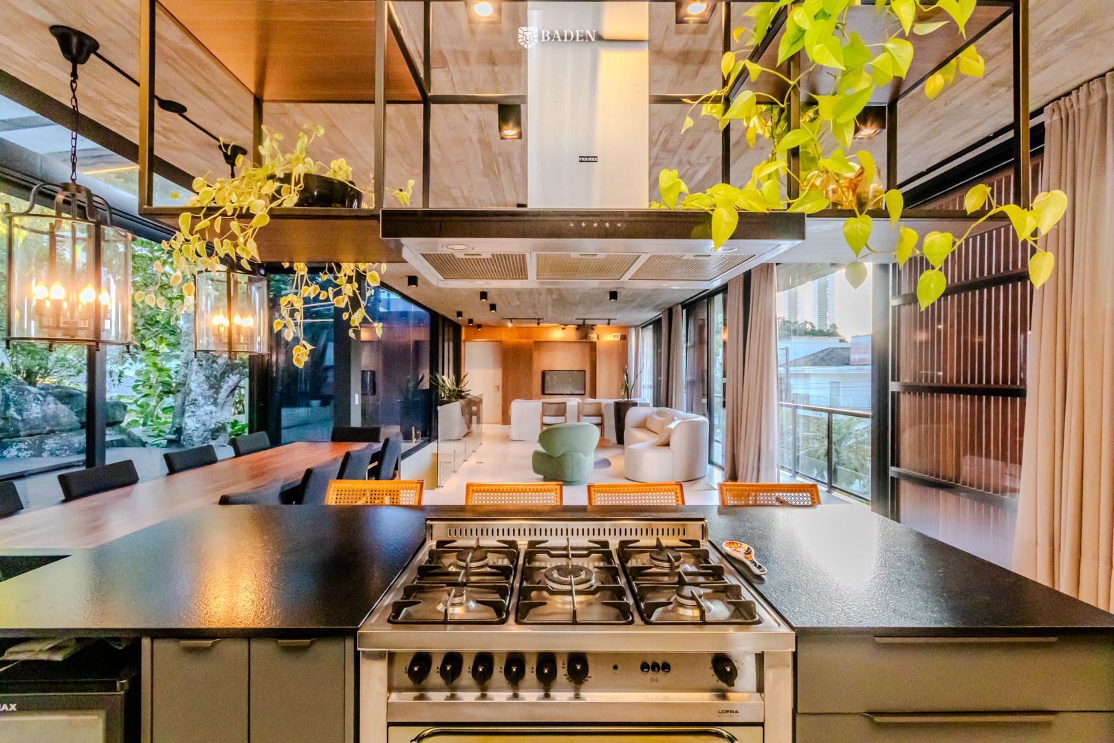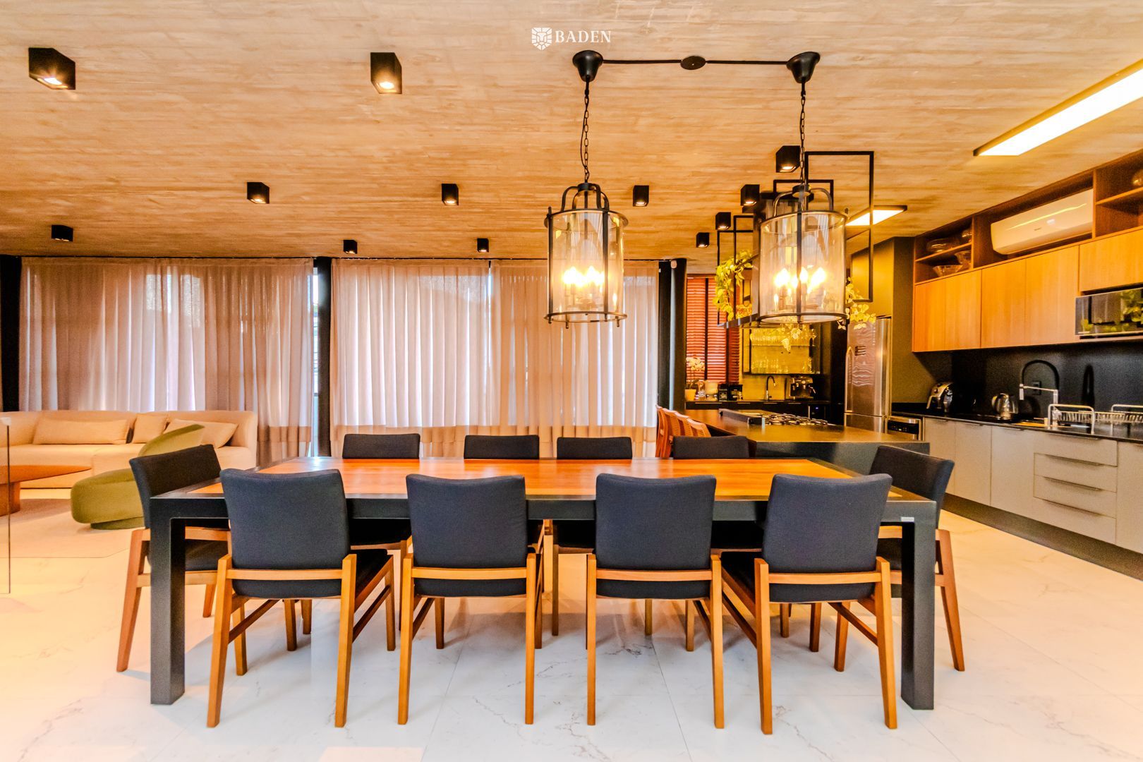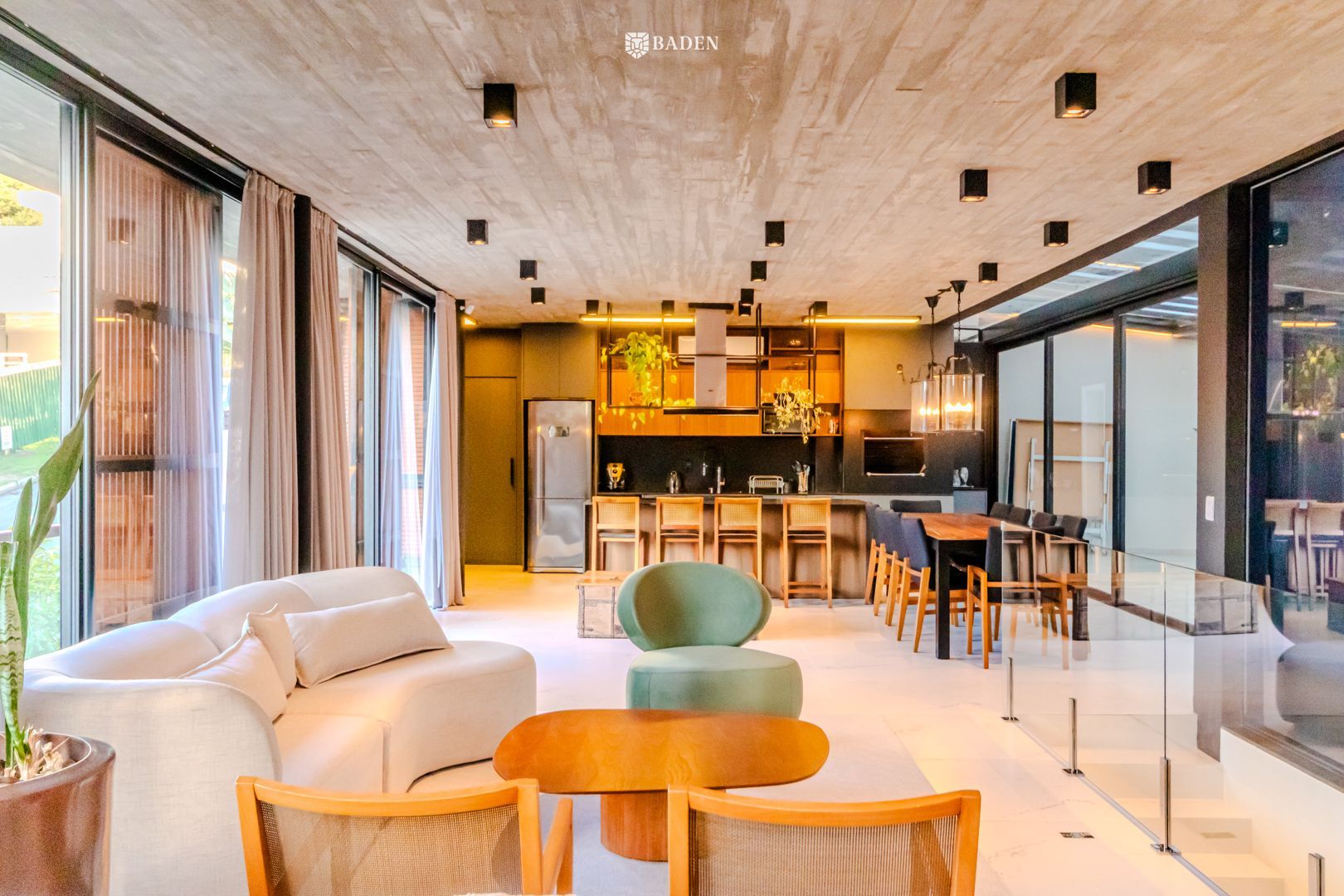 * **Ambientes amplos e integrados**, incluindo living, sala de estar, jantar e escritório