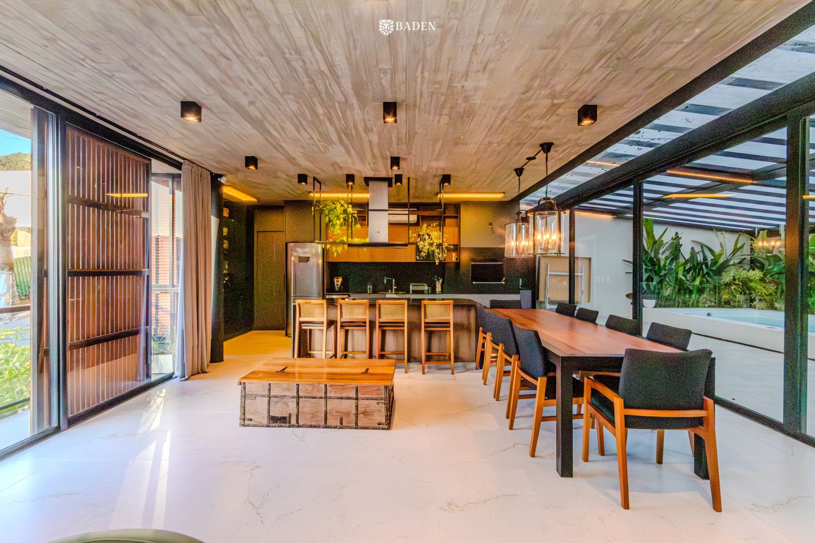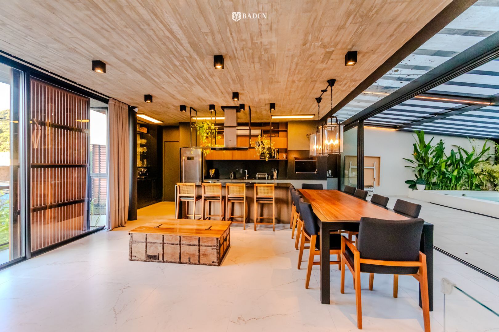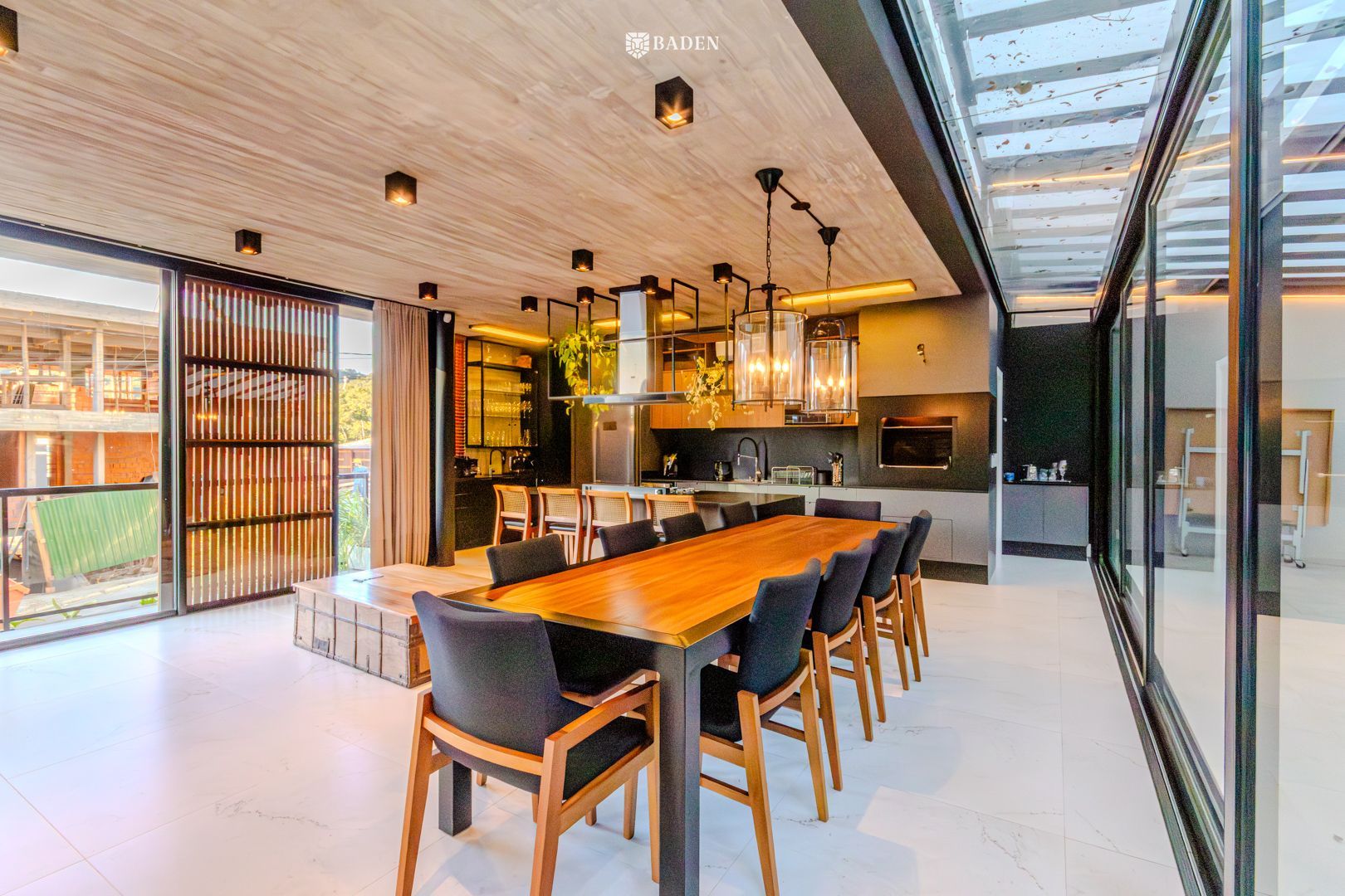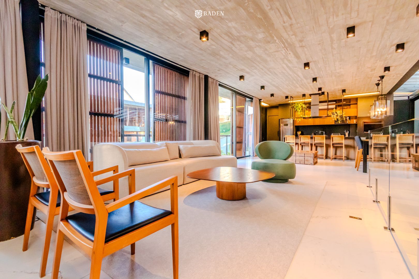 * **Ambientes amplos e integrados**, incluindo living, sala de estar, jantar e escritório