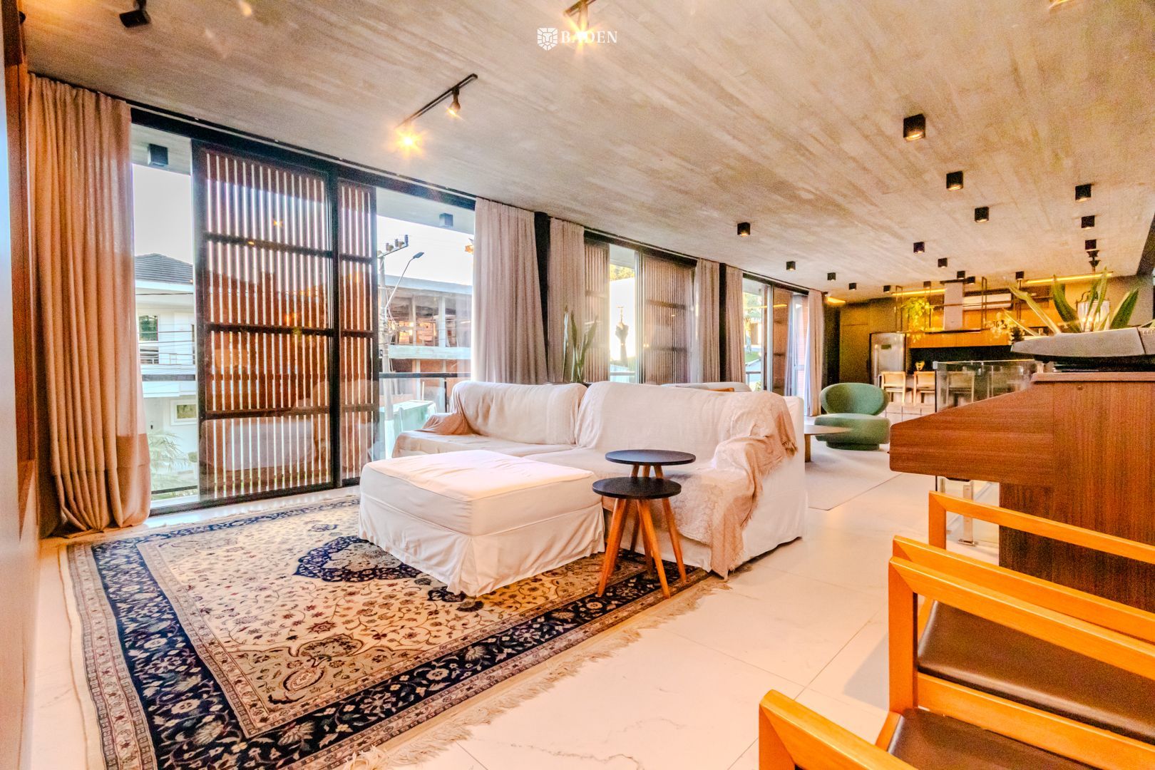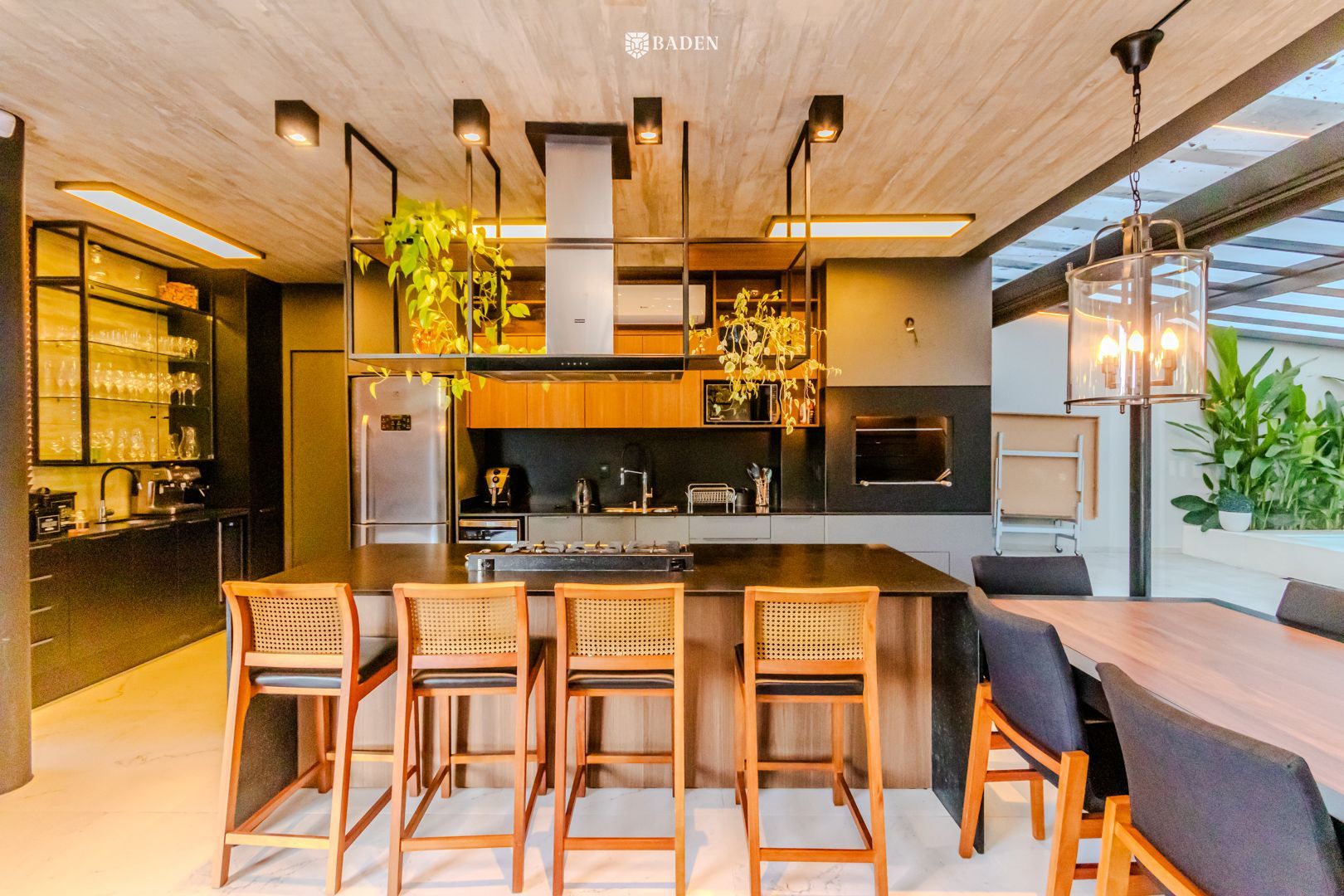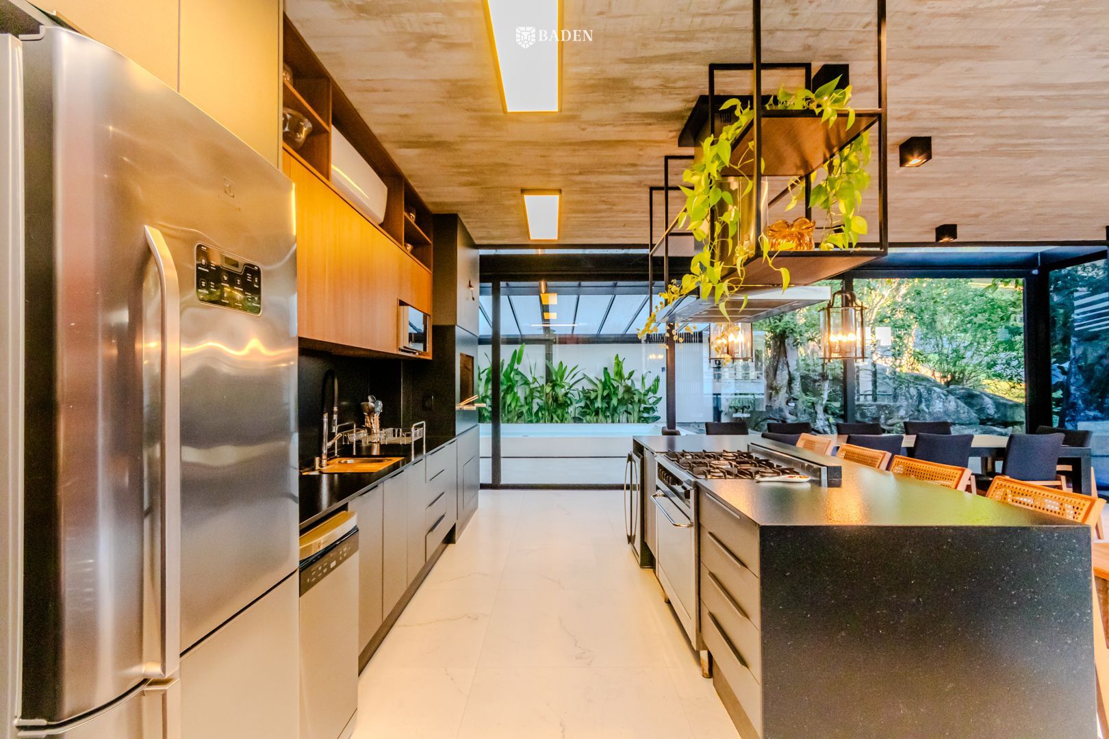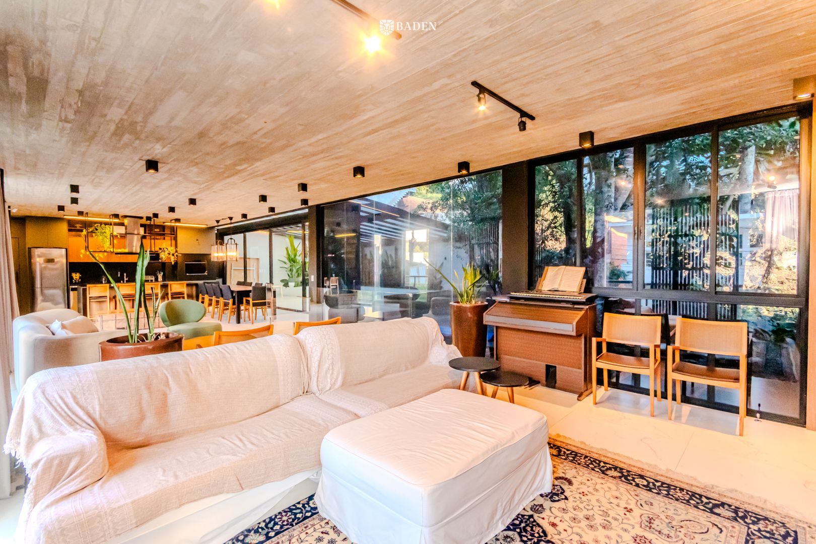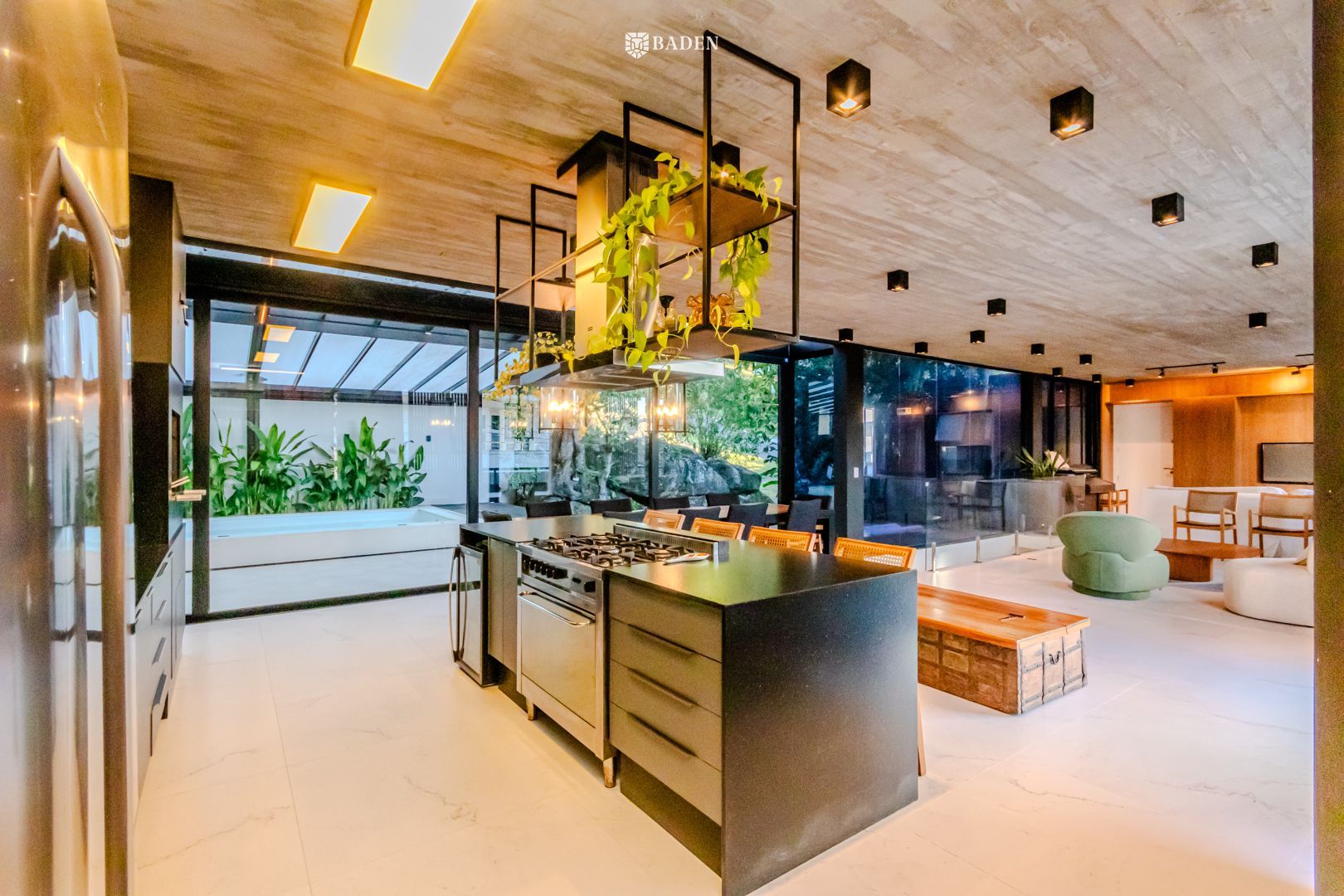 * **Ambientes amplos e integrados**, incluindo living, sala de estar, jantar e escritório